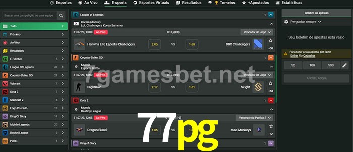 O 77pg oferece uma grande seleção de opções de apostas em e-sports com probabilidades competitivas